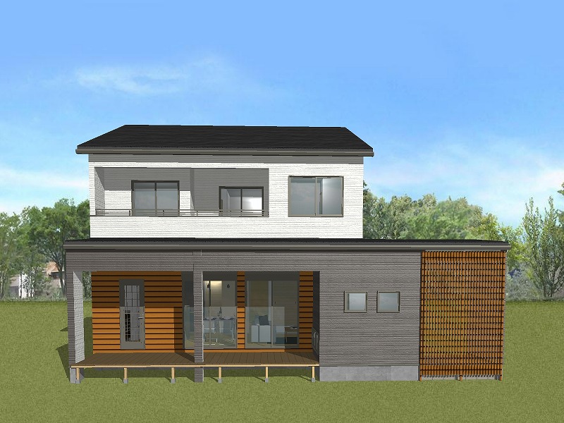 モノトーンの外観に木の板パネルと格子がアクセントになっています。