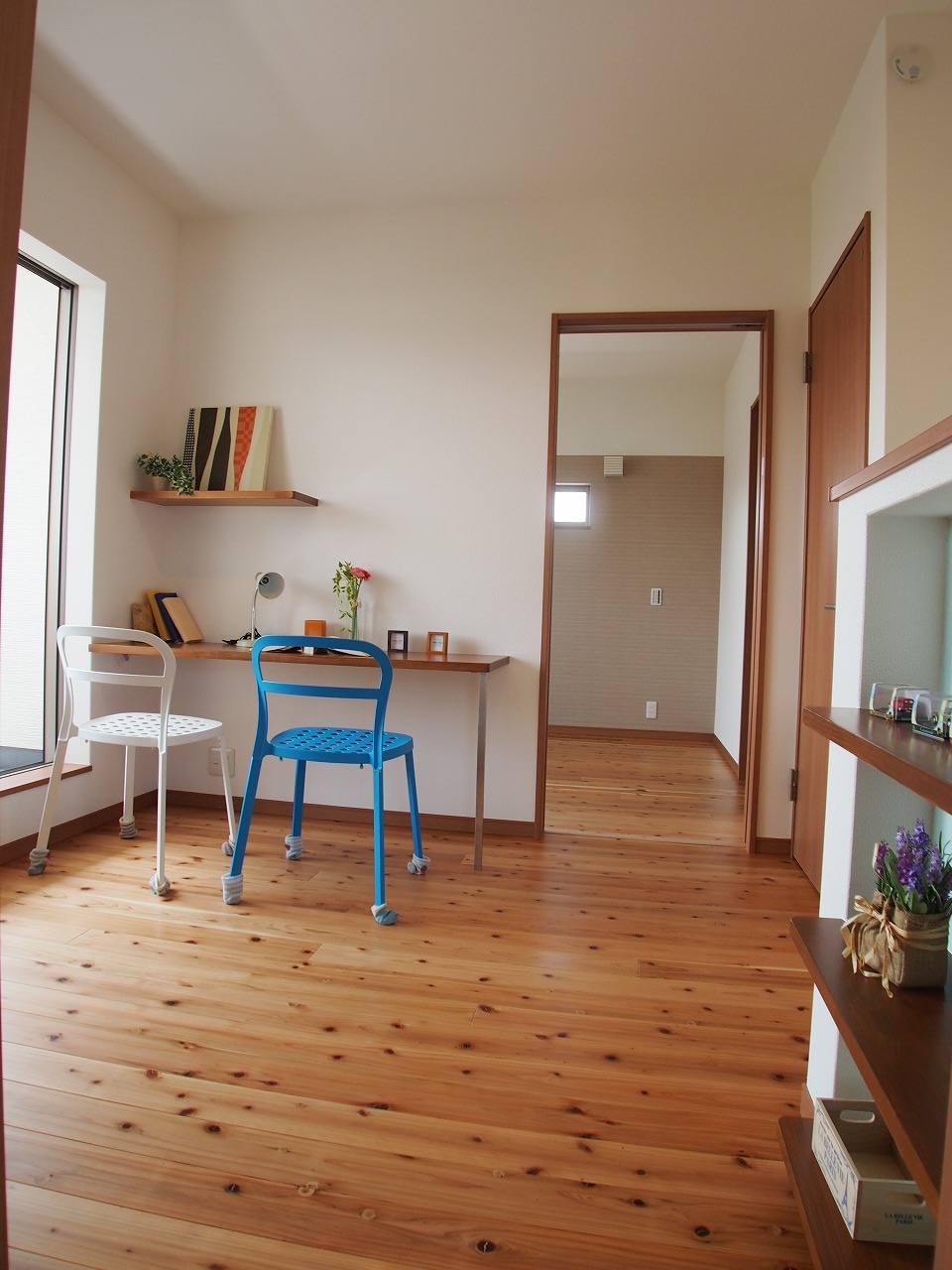 2階のファミリースペースにはデスクコーナーと造作棚を設け、