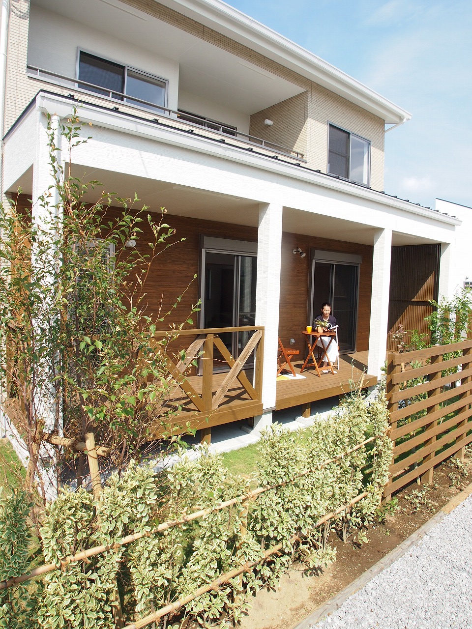 木の質感と、植栽の緑が心地よいアウトドアリビングになっています。