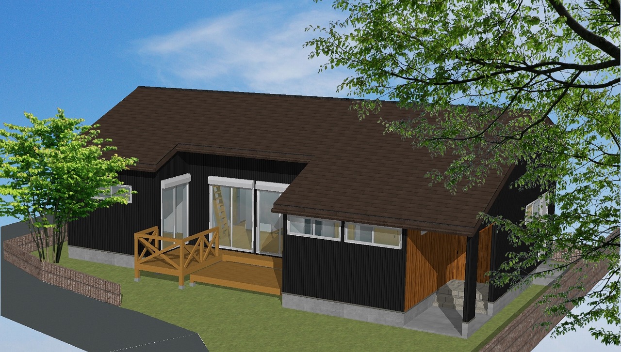 また、外観はネイビーと木を組み合わせ、屋根の裏側にも木調の板を貼り、