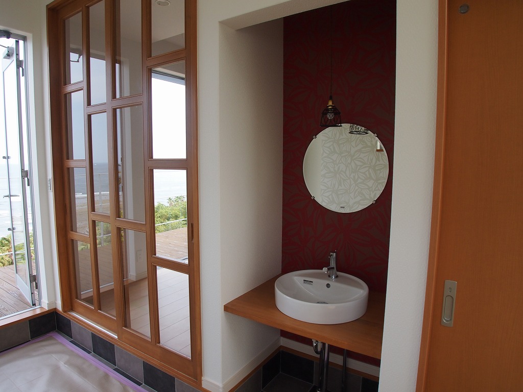 アジアンテイストの玄関と窓からのぞく海がお出迎え。