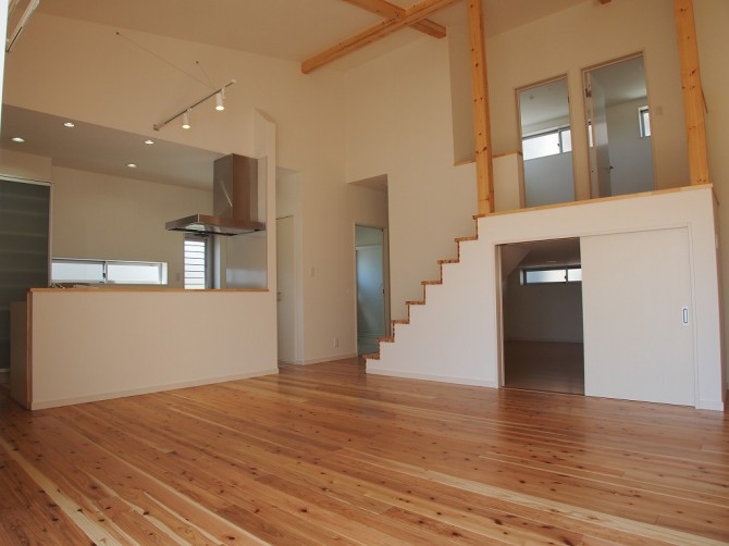 杉の床材と梁の木質感がナチュラルで気持ちのいい空間になっています。
